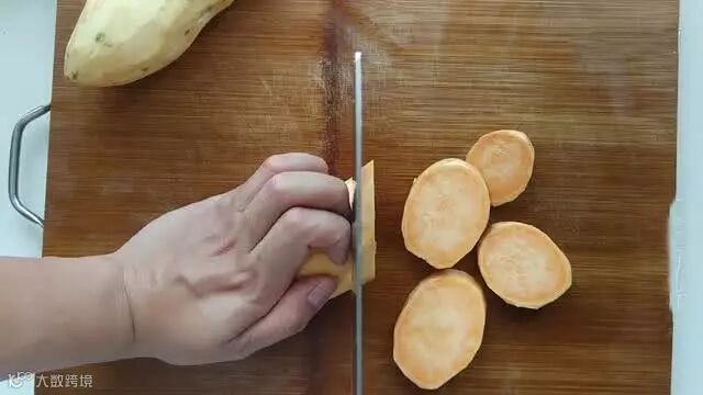 1、挑几根小点的地瓜,先去掉皮再洗净,然后将它切成3-5毫米的薄片,切的薄点可以缩短蒸煮的时间,可节约不少燃料。