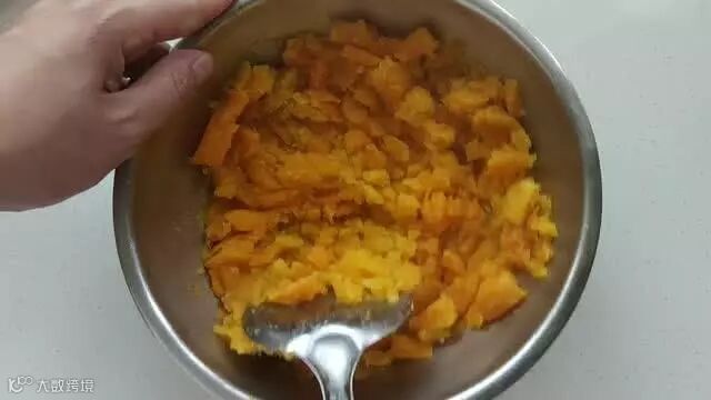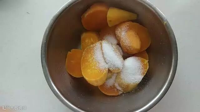 3、将蒸好的地瓜片放凉,再放入适量的白糖,这样吃起来不上火,然后将它碾压成地瓜泥,如上图所示。