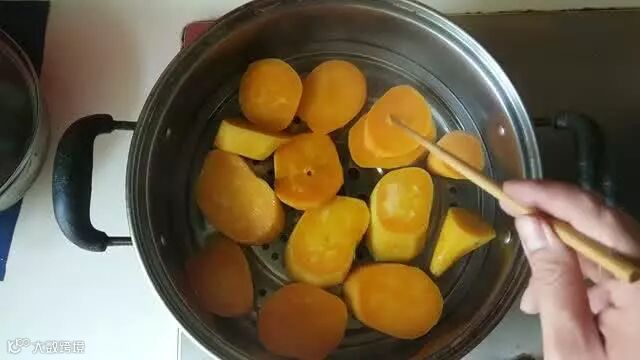 2、锅中烧水,锅开上汽后,将地瓜片放入蒸盘中,盖上锅盖转小火,隔水蒸15-20分钟左右,用筷子可穿透过去,就代表熟透了。