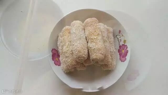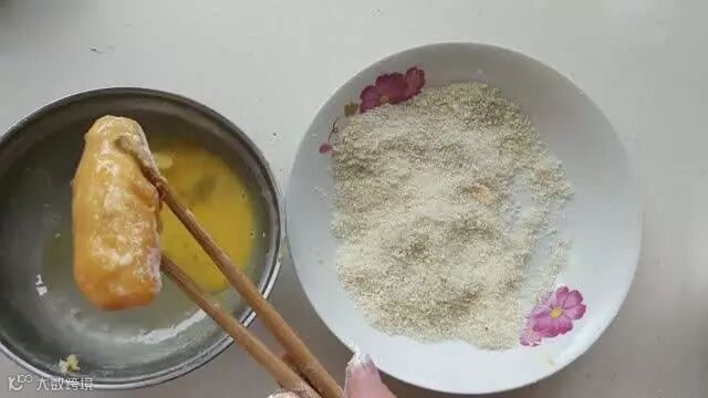 5、先轻轻的蘸点面粉,薄薄的一层就行,再放入蛋液中转上2-3圈,再放到面包糠中滚几下,多蘸几个就顺手啦。
