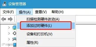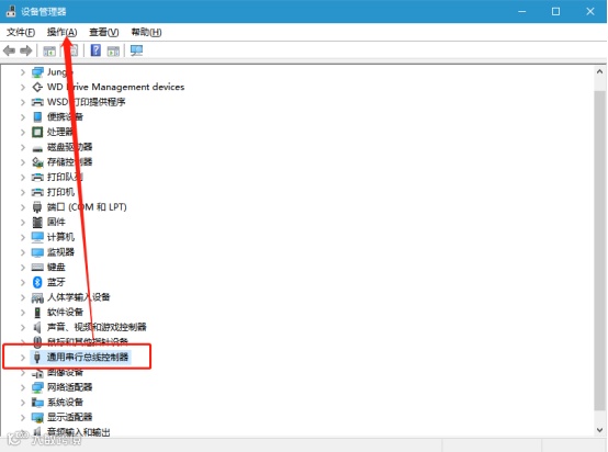 18、打开“设备管理器”后,选中“通用串行总线控制器”,点击“操作“添加过时硬件”