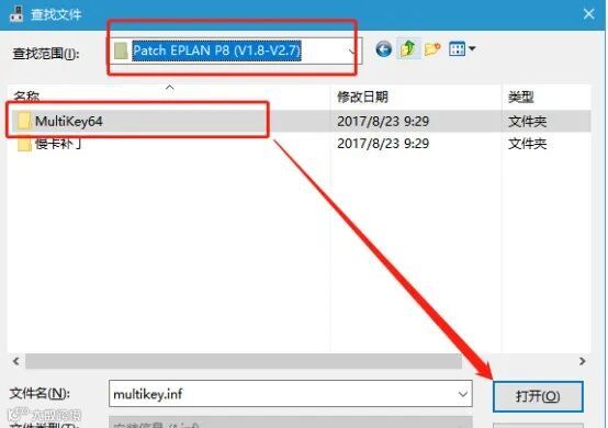 22、打开浏览,找到Patch EPLAN P8 (V1.8-V2.7)文件夹中的MultiKey64文件夹,选择组件multikey.inf,点击确定,点击下一步,再点击下一步,这样组件就安装完毕了