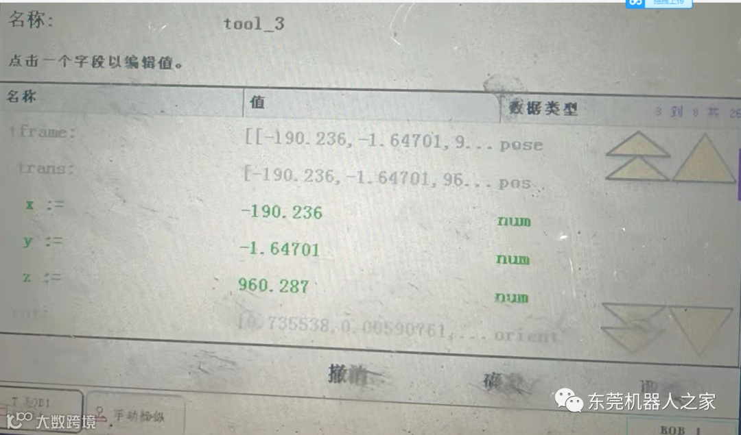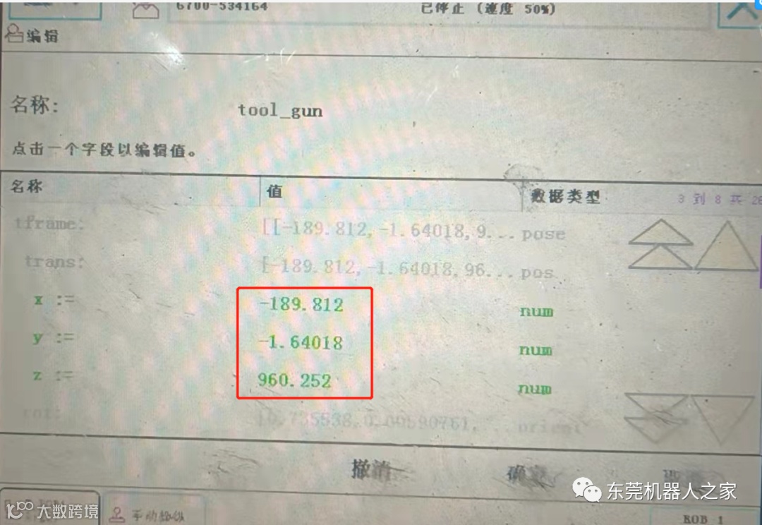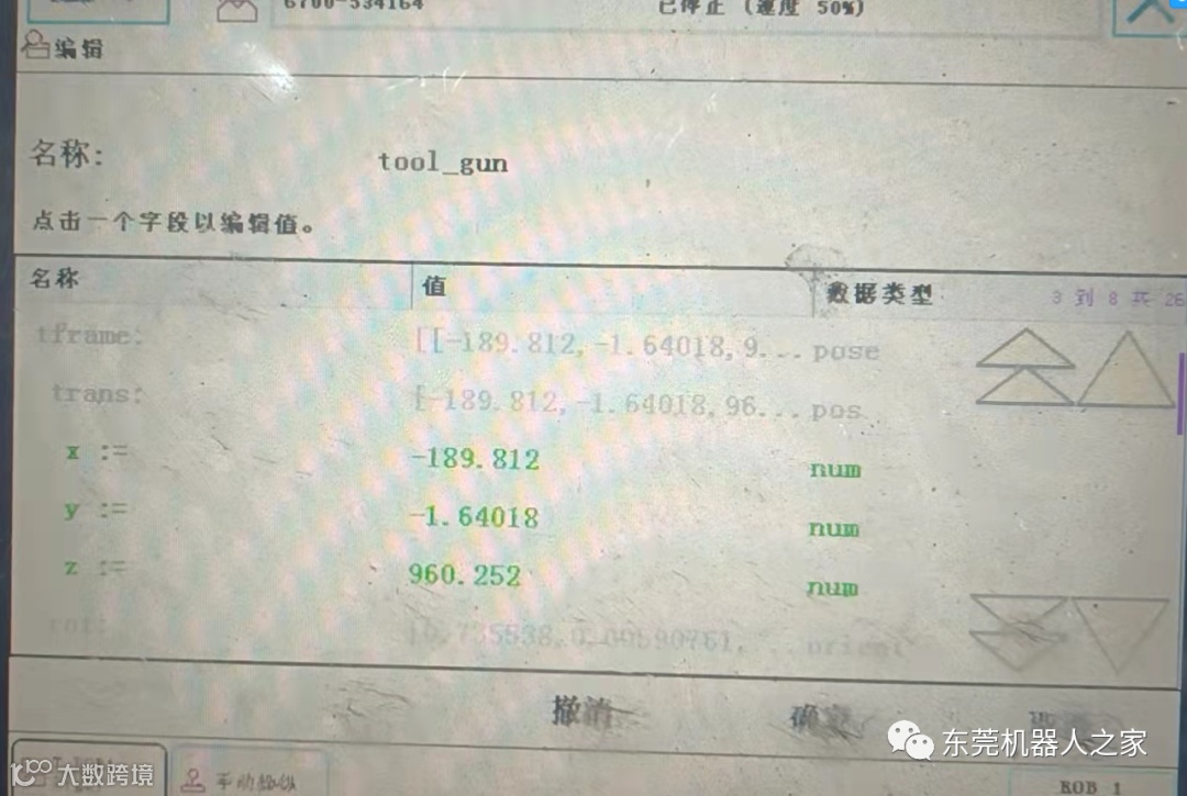 2、注意确认工具坐标的补偿量是否准确:最好是提前复制一个工具坐标命名为tool_3(有问题时,便于快速恢复原始的工具坐标数值)。tool_gun是校准后的TCP工具坐标补偿,那么在程序焊点使用sportL行时一定要使用校准后的TCP工具tool_gun。同时手动操作把工具坐标切换成tool_gun线性检查Z方向的数值变化是不是和tool_gun相对于原始的工具坐标tool_3的偏差值一样。