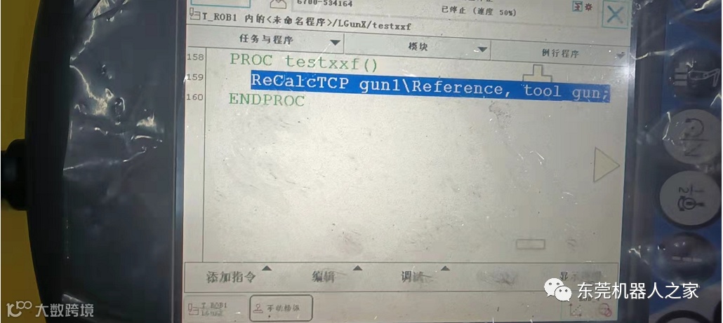 1、机器人修模的原理也是以一个点为基准进行补偿的,首先要做个焊枪的TCP点(tool_gun)定义在静电极的端面中心,焊枪的Z方向定义为焊枪静电极所指的方向,(注意焊枪的电极帽要是最新的,否则更换电极帽进行赋值的时候会出现很大的误差)然后执行下面的语句为了将TCP的数值永远的记住在主程序添加指令如光标所示,然后执行即可。