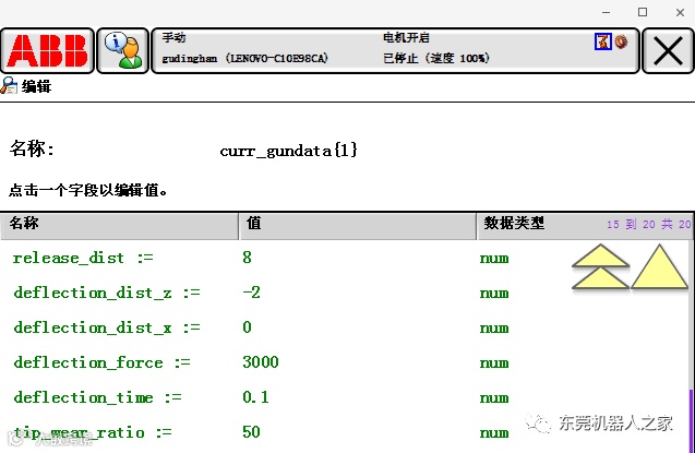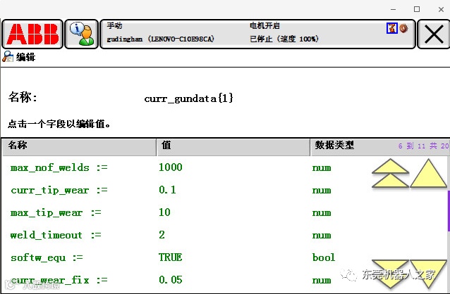 如果上下电极帽修磨的量不一样,需要更改静臂与动臂修磨补偿的比例更改.Gundata:焊枪参数里面的参数