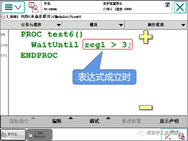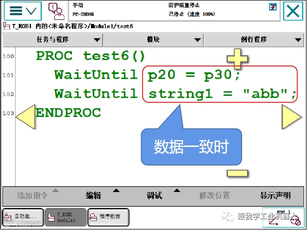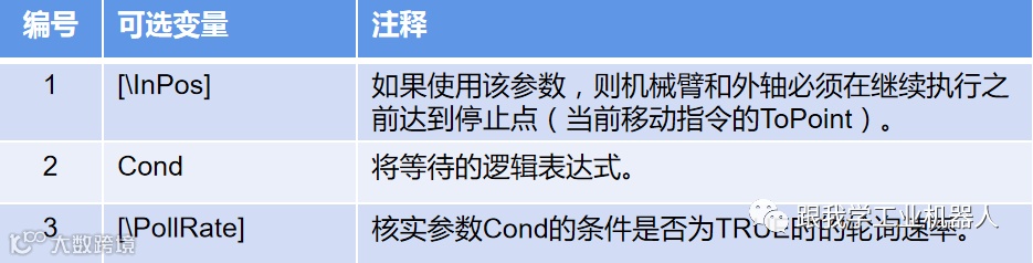 WaitUntil \Inpos无法与StopMove一同使用,以探测是否已停止移动。在这种情况下,可永远暂停WaitUntil指令。其并未探测到移动已停止,其探测到机械臂和外轴已达到最后编程的ToPoint(MoveX、SearchX、TriggX)。