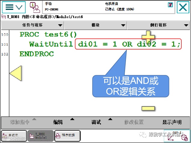 如果在5秒内未满足两个输入条件,那么将在FlexPendant示教器的显示器上编写消息。如果在60秒内未满足条件,那么将在错误处理器中继续执行。