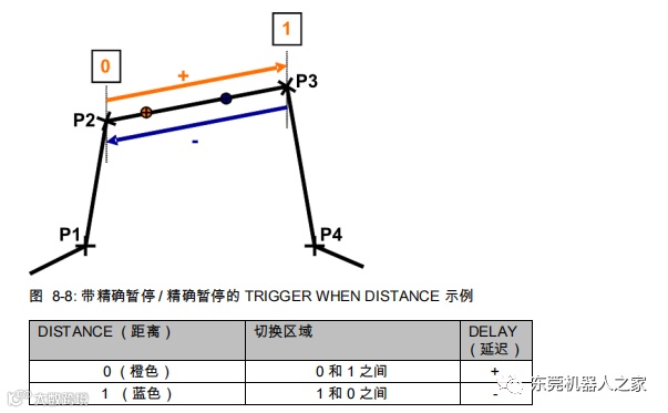 1:指令在目标点处被触发。如果目标点是轨迹逼近形式,则指令将在该轨迹逼近 弧形的中点处被触发。