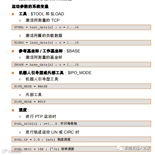 $ANIN[] 模拟输入$ANOUT[] 模拟输出BRAKE 刹车CIRC 圆弧运动CIRC_REL 圆弧相对运动CONTINUE 预读DECL 声明关键字DEF...END 模块声明DEFFCT … ENDFCT 函数声明EXIT 跳出FOR … TO … ENDFOR 计数循环FALSE 假GOTO 跳转GLOBAL 全局关键字HALT 停止IF … THEN ...ELSE… ENDIF 分支$IN[] 数字输入INTERRUPT … DECL … WHEN… DO... 中断声明INTERRUPT ON/OFF 中断启动/停止INTERRUPT DISABLE/ENABLE 中断不激活/激活LIN 直线运动LIN_REL 直线相对运动LOOP … ENDLOOP 无限循环$OUT[] 数字输出PULSE 脉冲PTP 点到点运动PTP_REL 点到点相对运动REPEAT … UNTIL 直到型循环RESUME 终止程序(中断)RETURN 终止程序(模块)SCIRC 圆弧运动8.5SCIRC_REL 圆弧相对运动8.5SLIN 直线8.5SLIN_REL 直线相对运动8.5SPTP 点到点运动8.5SPTP_REL 点到点相对运动8.5SWITCH … CASE … ENDSWITCH 分支SIGNAL 信号声明$timer[]$timer_stop[]$timer_flag[]TRIGGER WHEN DISTANCE 运动过程触发TRIGGER WHEN PATH 运动过程触发TRUE 真WAIT FOR 循环等待WAIT SEC 时间等待WHILE … ENDWHILE 当型循环