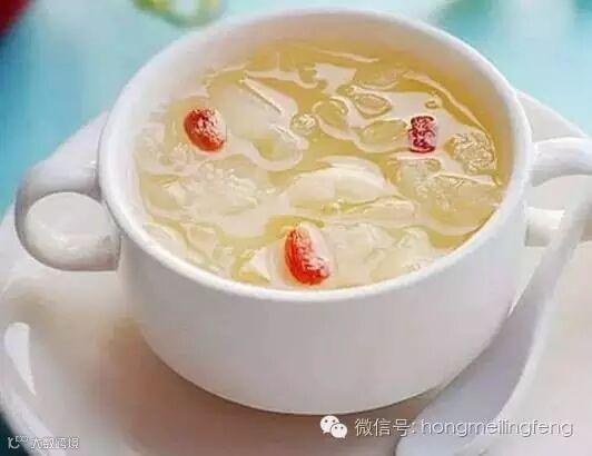 做法:将雪梨洗净,去皮、去核,切成小块备用。银耳泡发半小时后,洗净撕成小朵;百合、枸杞洗净待用。在锅中倒入清水,放银耳,大火烧开,转小火将银耳炖烂,放入百合、枸杞、雪梨、冰糖,炖至梨熟即可。