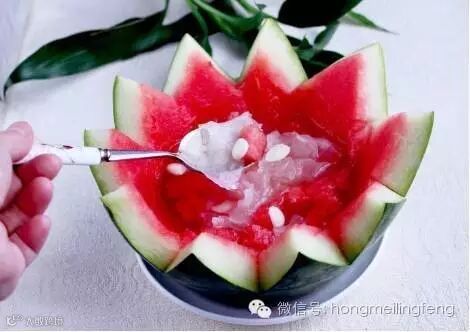 做法:将西瓜在蒂处开一圆口,取下盖,挖出西瓜瓤和籽,保持瓜壳完整。将整个瓜壳洗净,并用开水冲烫瓜壳内壁。再把挖出的瓜瓤、瓜子包于纱布之中挤压,取其汁水。将沙锅置火上,加水烧沸后下入冰糖煮化后加入水发银耳。再将西瓜汁倒入冰糖银耳中,待烧开后,倒入西瓜壳中,盖上瓜盖,置于盘中即成。