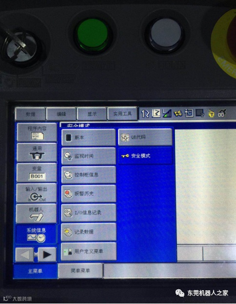 1.安川机器人示教器钥匙切换到手动Teach模式—主菜单—系统信息—安全模式