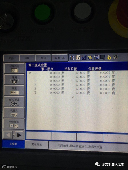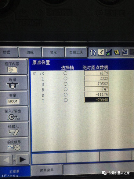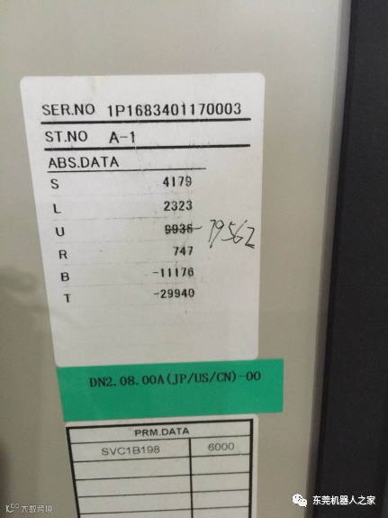 5.把控制柜门侧面上有机器人6个轴的机械原点按对应的轴数据输入进去