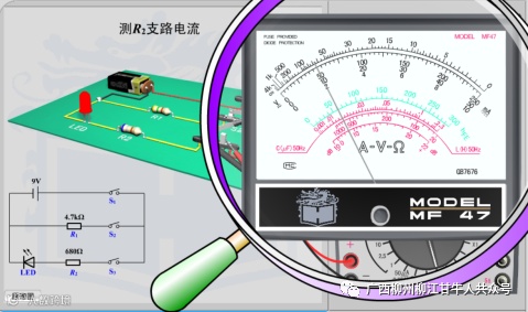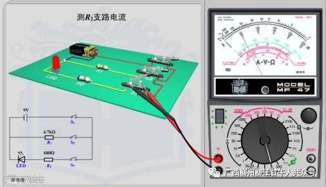 (2)电路断开不通电,把指针万用表串联到被测支路中;