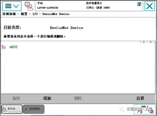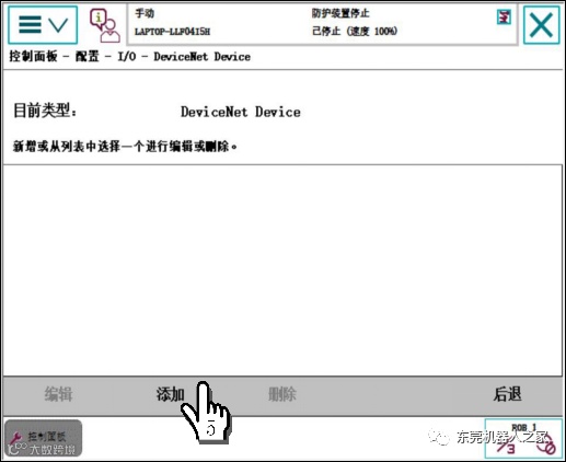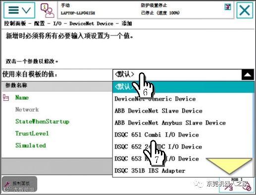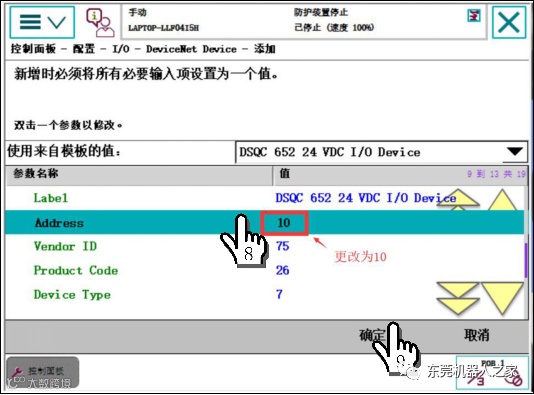 步骤为:1单击ABB主菜单—2单击【控制面板】—3单击【配置】—4双击【DeviceNet Device】—5单击【添加】—6单击【默认】—7选中DSQC652—8把address值更改为10—9单击确定—10单击【是】。