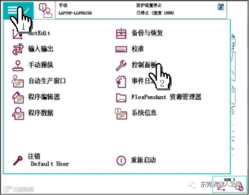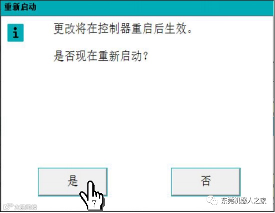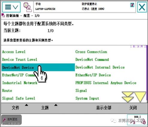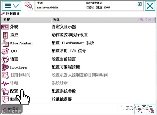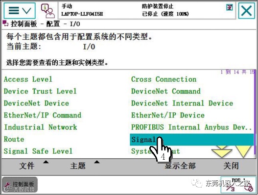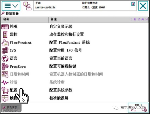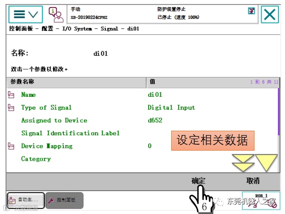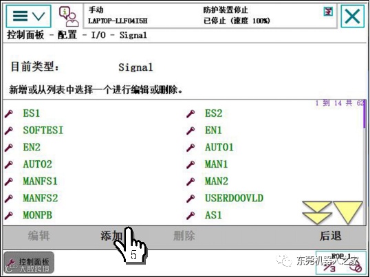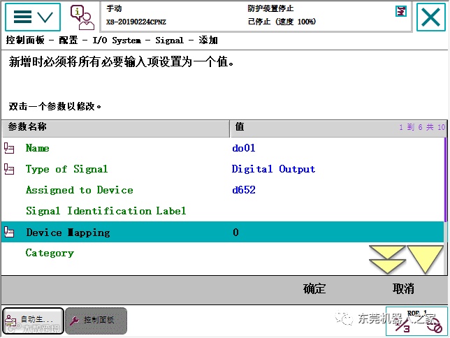 1单击ABB主菜单—2单击【控制面板】—3单击【配置】—4双击【Signal】—5单击【添加】,参考上表进行设置—6单击【确定】—7单击【是】。重启控制器生效。