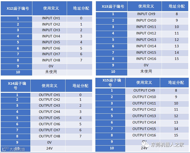 ABB机器人紧凑型柜子xs12、xs13、xs14、xs15 IO端子对应的地址如下: