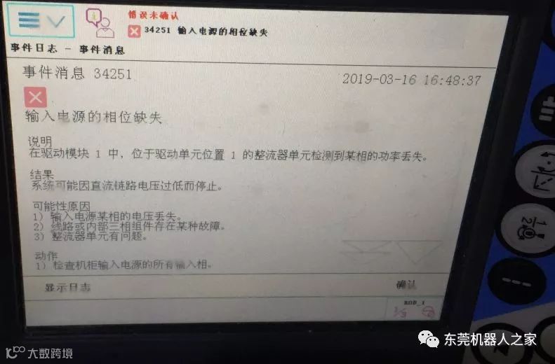 (2).ABB机器人开机出现“34251输入电源的相位缺失”故障如下图: