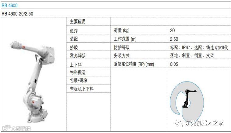 综上所述工业机器人的选型:a.品牌、b.用途、c.工作范围(臂展)、d.工作载荷(有效载荷)、e. 防护等级 、f. 工作精度 、g. IO板输入输出点数等等。