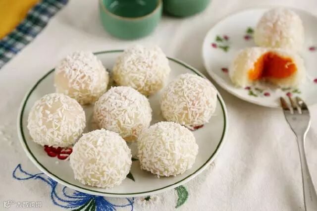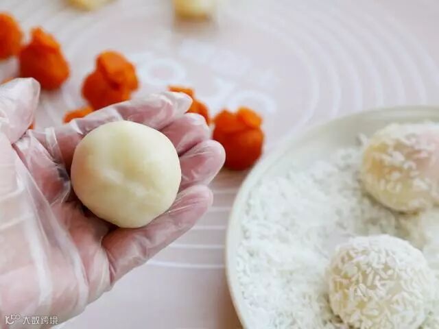 13.然后裹上椰丝,一个糯米糍就完成了,依次做完全部。
