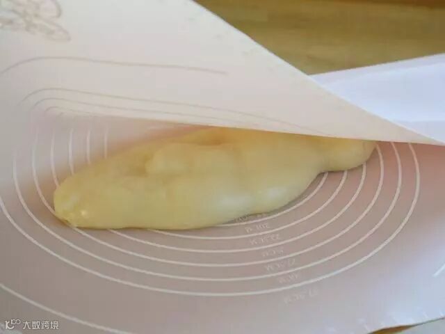 7.熟透糯米糍皮放入塑胶垫里,揉搓,或擀压。