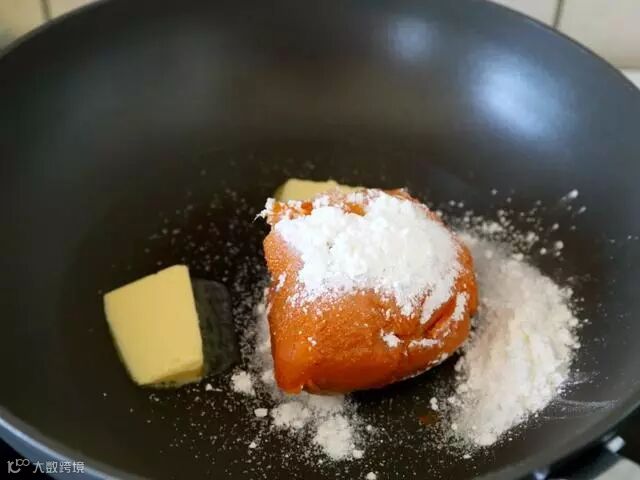2.然后将地瓜放入炒锅,同时将糖35克、黄油22克、玉米淀粉15克也放入锅中。