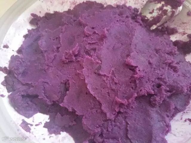 4、蒸好的紫薯用勺子压成泥。