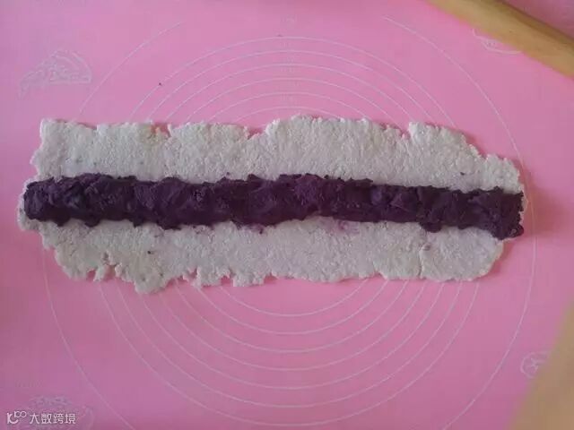 5、西米团用擀面杖擀成长方形,放上紫薯泥。