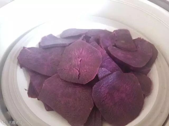 3、紫薯洗净、切片,上锅蒸15分钟至软烂。