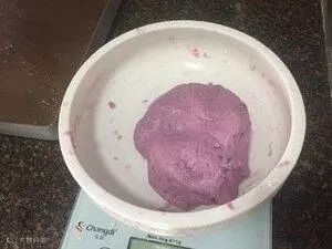 2、把紫薯泥,糯米粉,砂糖称好混合在一起。根据紫薯泥的湿度调整牛奶的量,混合成面团。我先加了30g,然后觉得干就逐步增加5-10g,加到55g的时候觉得刚好了就停止了加牛奶。如果紫薯泥较湿,可以减少牛奶的量