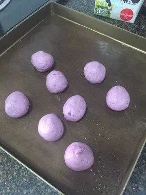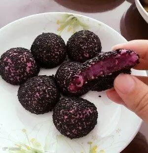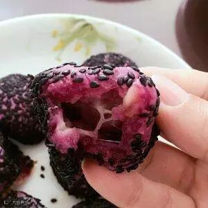 紫薯泥70g 糯米粉70g 砂糖30g 牛奶50-55g 芝麻适量 马苏里拉芝士20-40g