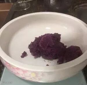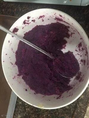 1、一个紫薯洗净,蒸熟,去皮,用勺子压成紫薯泥