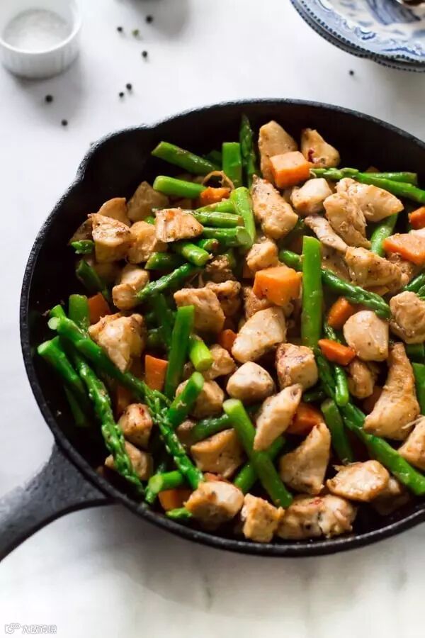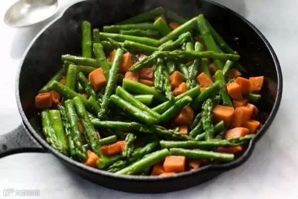 3.芦笋洗净、切好,放入锅中和红薯一起炒4-5分钟,撒上盐和胡椒粉,倒入鸡丁,一起翻炒均匀,熄火,出锅。
