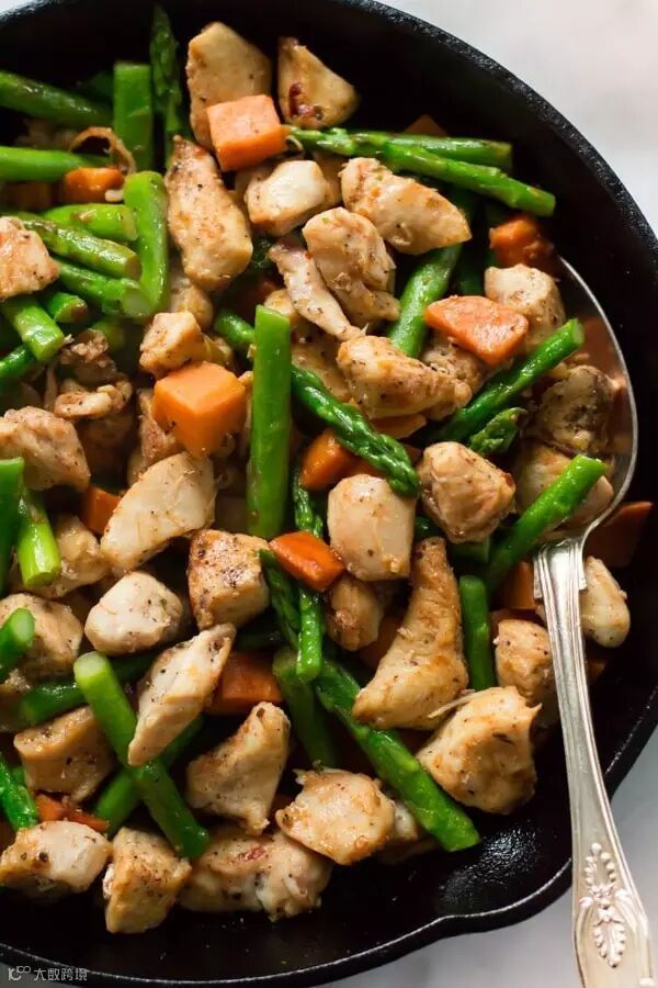 材 料 鸡胸肉500g,橄榄油1勺,盐1/3茶匙(用于烹制鸡胸肉)胡椒粉少许(用于烹制鸡胸肉),大蒜3瓣,红薯(去皮、切块),鸡高汤120ml,芦笋225g,盐1/2茶匙,胡椒粉1/2茶匙。