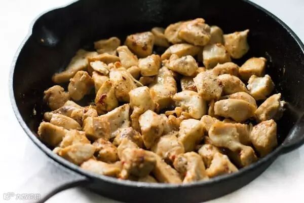 1.将鸡胸肉切丁,撒上盐和胡椒粉。取出平底锅,调至中火,加入橄榄油、大蒜和鸡肉,炒7-10分钟至完全炒熟。