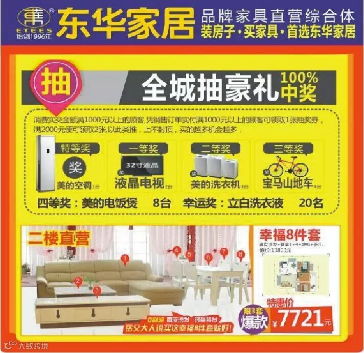 活动期间购物当天累计交全款满8000元可获赠价值300元家电;满15000元可获赠价值900元家电;满30000元可获赠价值1500元家电;满50000元可获赠价值2000元家电;满80000元可获赠价值3000元家电,让你占足便宜!