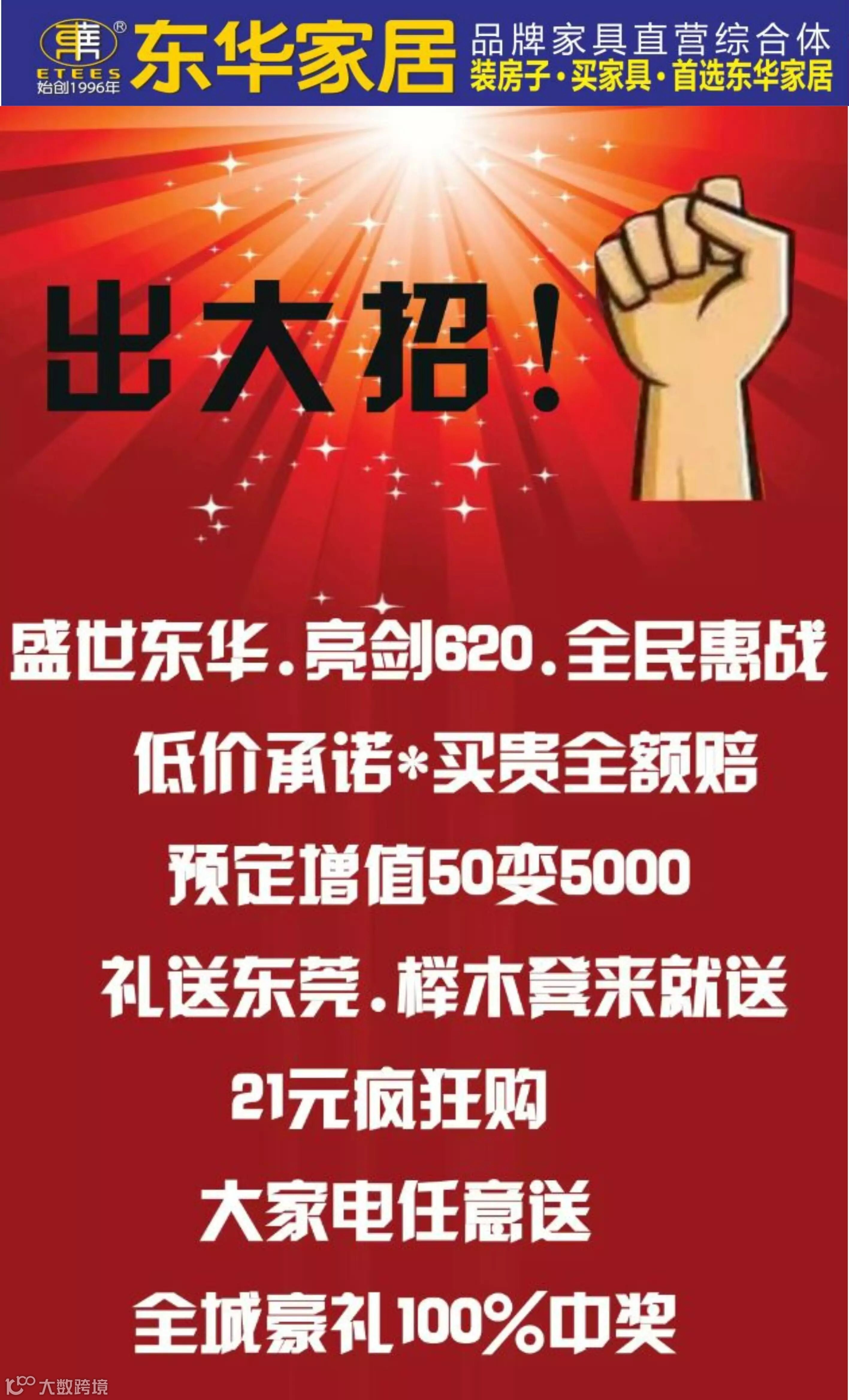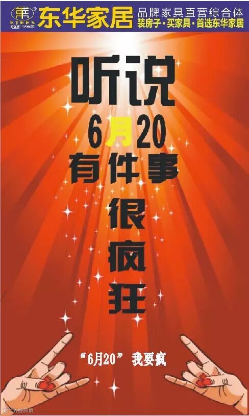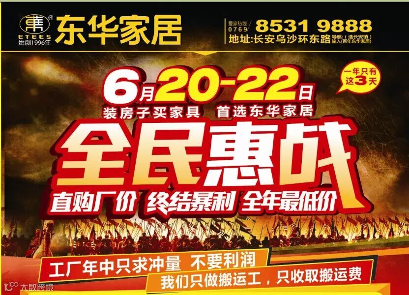 盛世东华.亮剑620,全民惠战2015年6月20-22日工厂直营联盟300多家工厂年中只求冲量,不要利润。一年一度家具工厂价格大抄底,我们只做搬运工,只收取搬运费)更有6大优惠送给爱家的您。