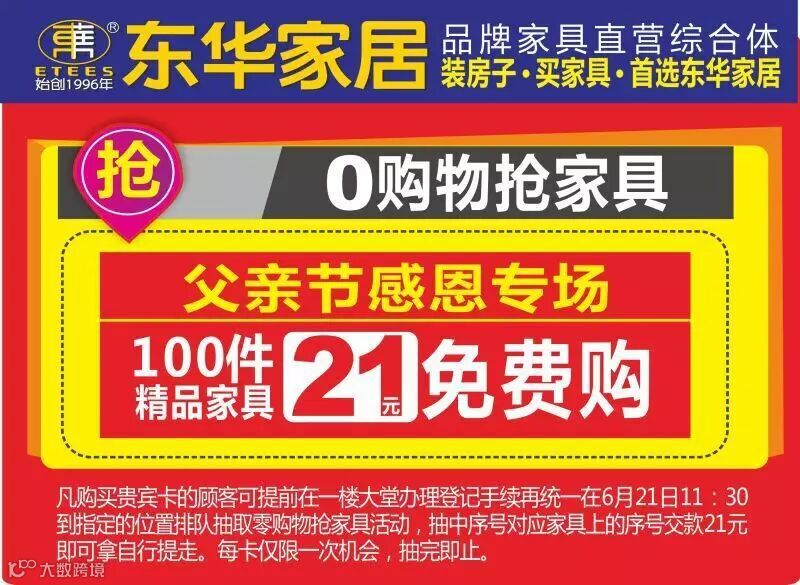 凡购买贵宾卡的顾客可提前在一楼大堂办理登记手续再统一在6月21日11:30到指定的位置排队抽取零购物抢家具活动,抽中序号对应家具上的序号交款21元即可拿自行提走。每卡仅限一次机会,抽完即止。活动时间:2015年6月21日 11:30;(父亲节)