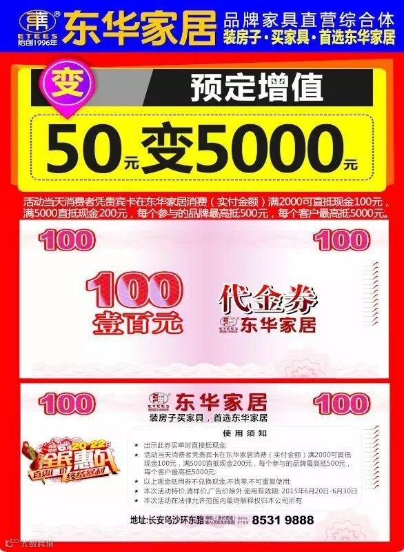 活动规则:活动当天消费者凭贵宾卡在东华家居消费(实付金额)满2000可直抵现金100元,满5000直抵现金200元,每个参与的品牌最高抵500元,每个客户最高抵5000元。(使用有效期:2015年6月20日-6月30日)
