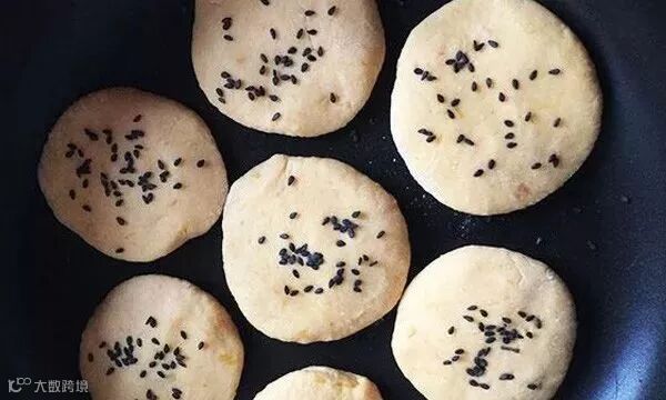 6、取平底锅,放入红薯饼,撒上黑芝麻(宝妈可以根据自己喜欢撒白芝麻或者黑芝麻哦,黑芝麻可使宝宝头发黑浓密哟),煎的时候一定要有耐心,注意用小火哟,不然容易焦