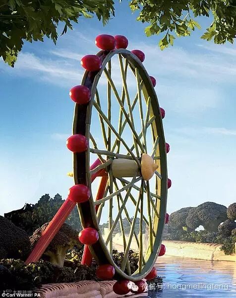 除此之外,伦敦的风景名胜都被“改头换面”。例如,“伦敦眼”是用绿豆做辐条,吊舱由李子番茄来制作。泰晤士河边的路灯也同样制作精细,工艺大师们把洋葱镶在香草荚里充当灯泡,芦笋则是很好的灯杆,鲭鱼成了装饰华丽的鱼展台。圣保罗大教堂的塔尖用了萝卜、黄色和绿色的胡瓜以及小韭蒜。伦敦千禧穹顶由甜瓜打造。