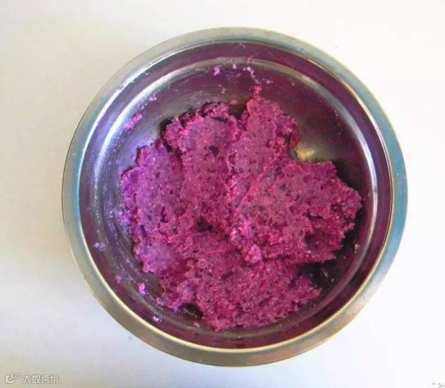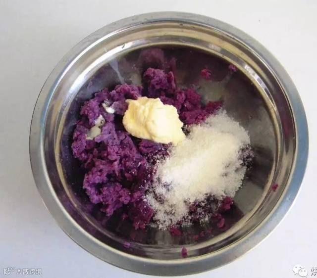 7. 紫薯碾成泥,放入奶油,牛奶,炼乳和椰蓉