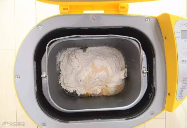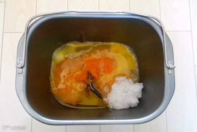 3. 面包桶内先放入南瓜泥,玉米油,全蛋液,盐,糖。