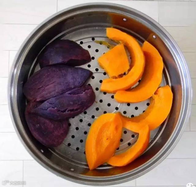 1. 紫薯和南瓜用蒸锅蒸熟备用。(一般切块水开后蒸20分钟就可以)