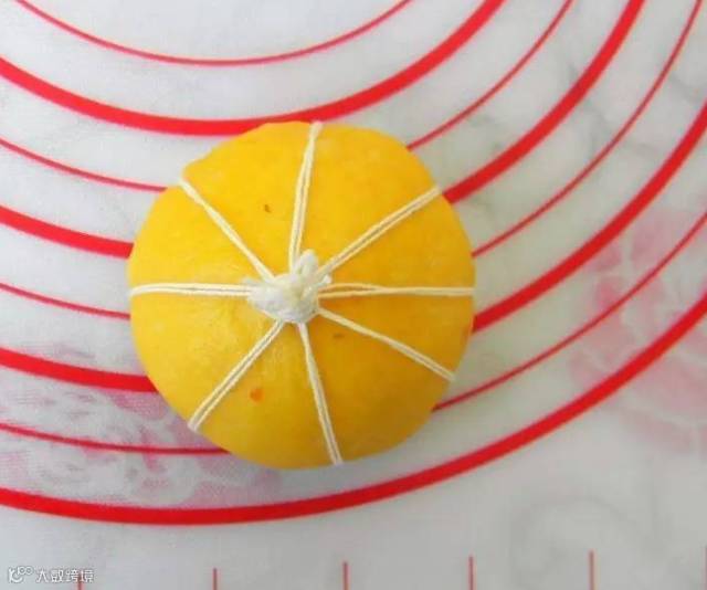 14. 用四根线绳米字形状摆开,中心点处放包好馅的面剂子