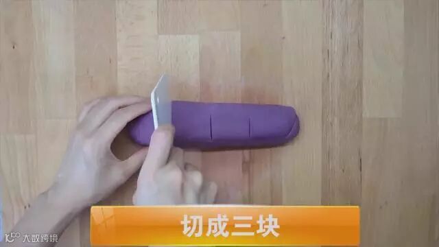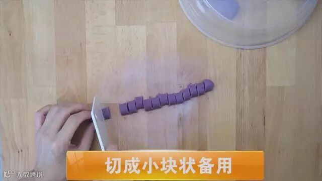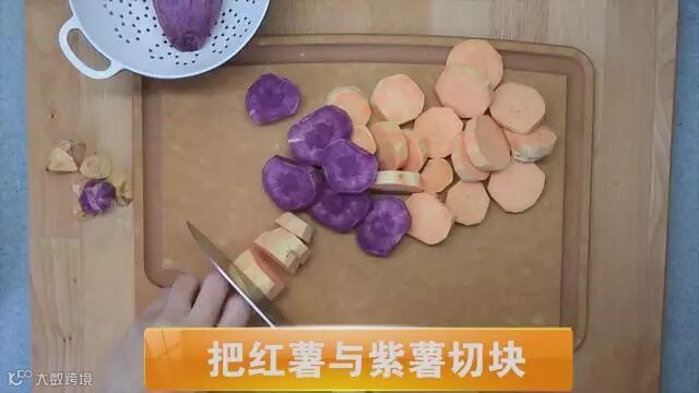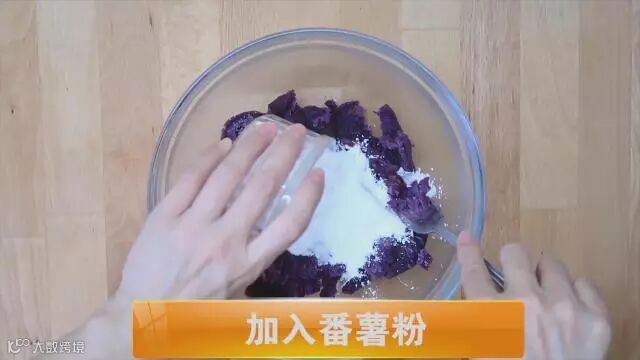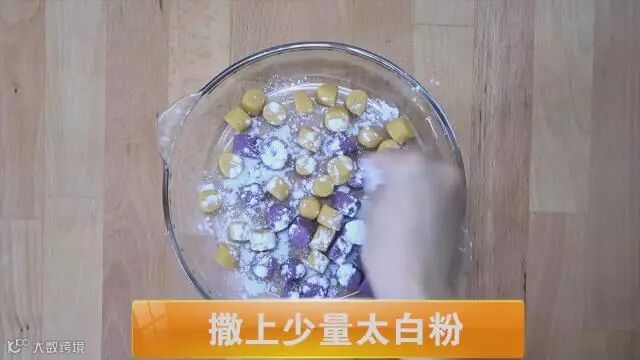 将红薯紫薯切块,在锅里蒸熟后放入碗中,加入白糖番薯粉,搅拌均匀,和成面团,弄成粗条状,切成三块备用。