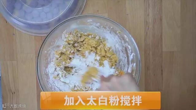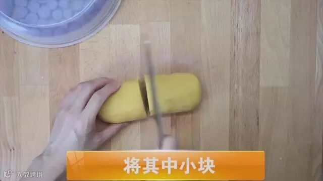将分成三份的面团,切成小块状备用。把红薯捣碎,加入番薯粉、太白粉,搅拌均匀,和成面团,切三块,将其弄成小方块备用。