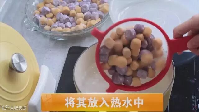 将紫薯、红薯混合,撒入少量太白粉,摇晃均匀。再放入红薯粉,加入少量番薯粉,摇晃均匀后放入热水中,锅开后加入少量水,静等5分钟,地瓜圆做好了。
