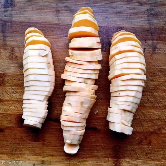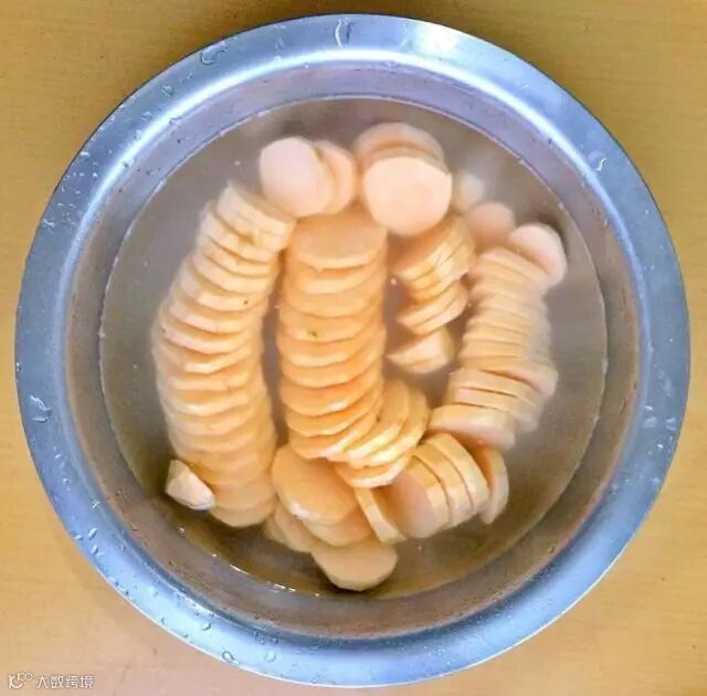 第四步,将切好的地瓜片在清水中浸泡,主要是去掉表层的淀粉,以免煎时粘锅。