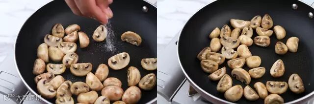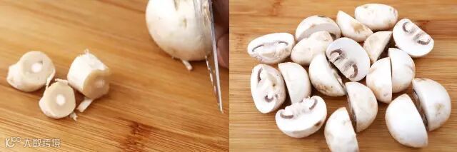 白蘑菇洗干净,去蒂对半切开